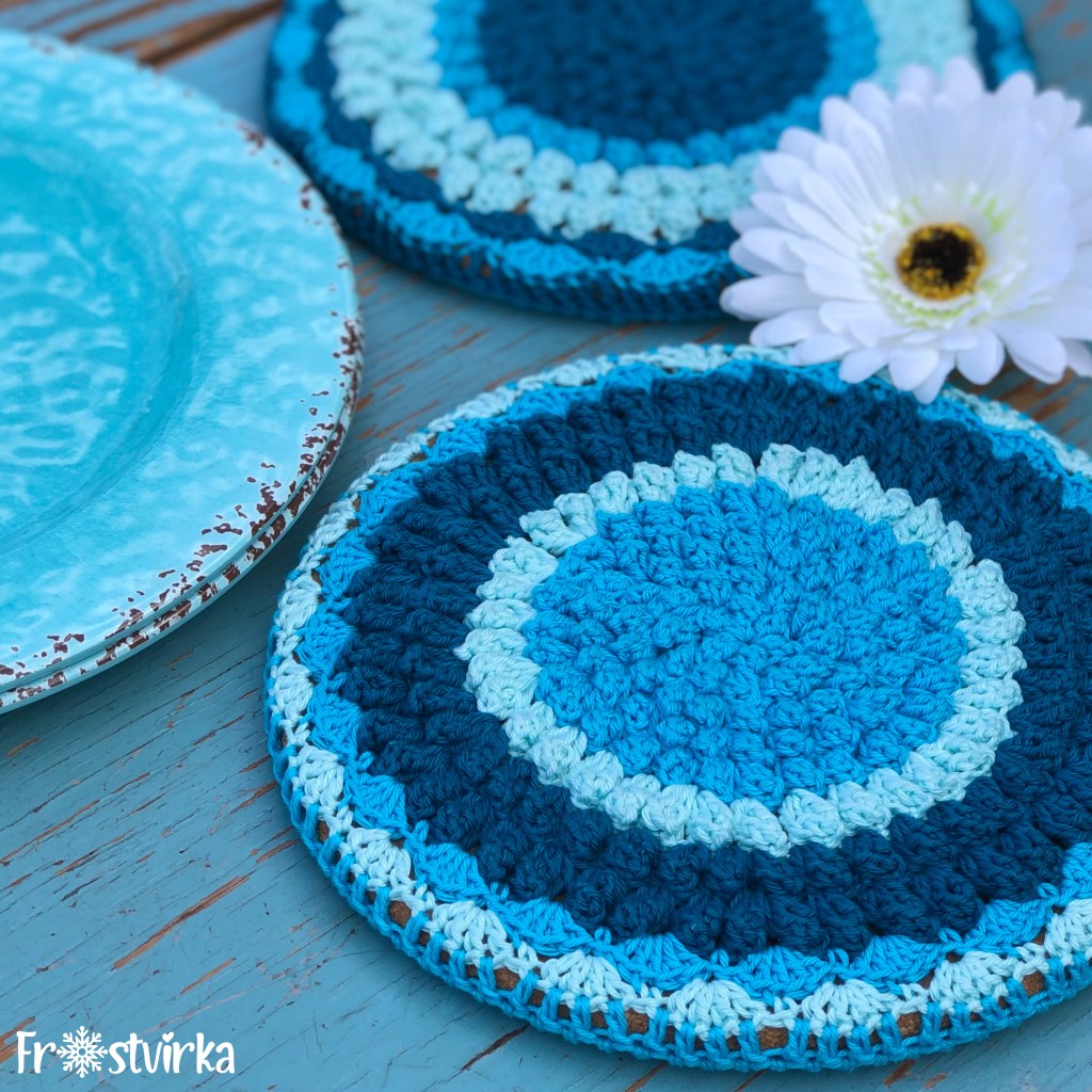 När jag gjorde mönstret till mina grytunderlägg Dinner for Two kände jag direkt att det skulle kunna anpassas även till grytlappar. Jag tycker ofta att grytlappar är alldeles för små och tunna så därför gjorde jag dessa stora och dubbla. Ingen risk att bränna sig! 😊 Diametern på grytlapparna är ca 22 cm.