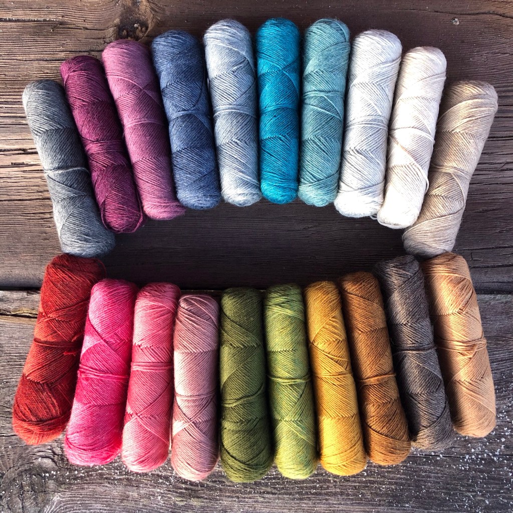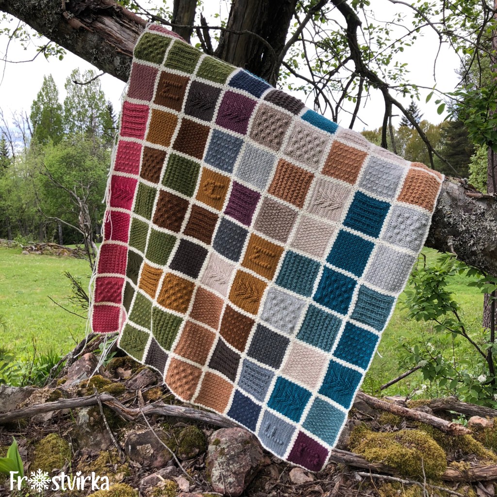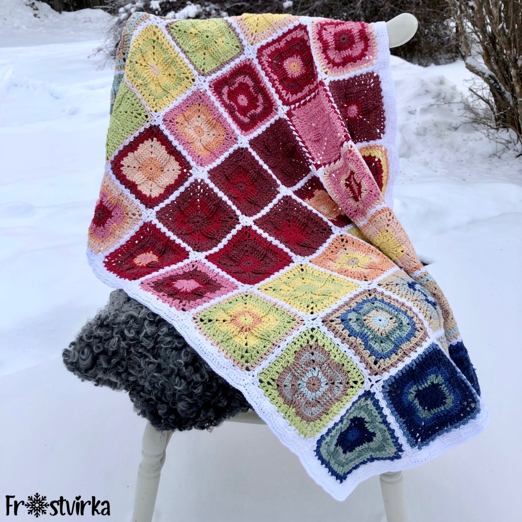 Jag rekommenderar att köpa ett startpaket med en av varje färg och sen fylla på för det är svårt att förutse hur mycket det kommer gå åt av varje färg. När jag gjorde min första filt var det en extremt varm sommar och då gick det åt 3 nystan av den varmaste färgen på den filten jag gjorde då. När jag gjorde min andra gick det inte ens åt ett halvt av den varmaste. Ni hittar de garnpaket jag använt hos Favoritgarner och där hittar ni numer också mina mönster