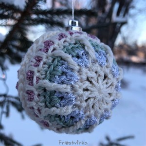 Gör 2 st cirklar. Virka ihop dem runt en julgranskula i rätt storlek. Jag virkar ihop dem i bakre mb. Fäst trådarna.
